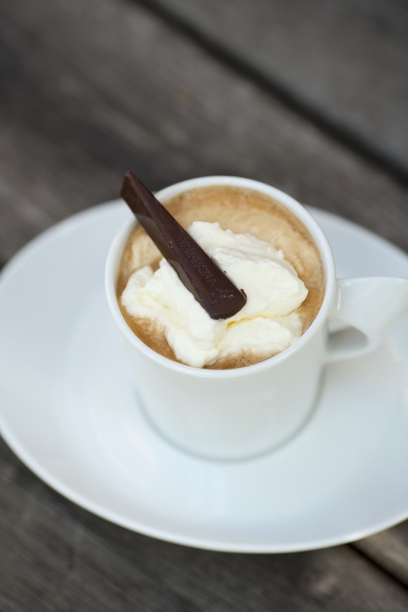 Häll likören i en kaffekopp, fyll på med en dubbel espresso och toppa med vispgrädde. Lägg slutligen en chokladpinne eller chokladbit ovanpå grädden.