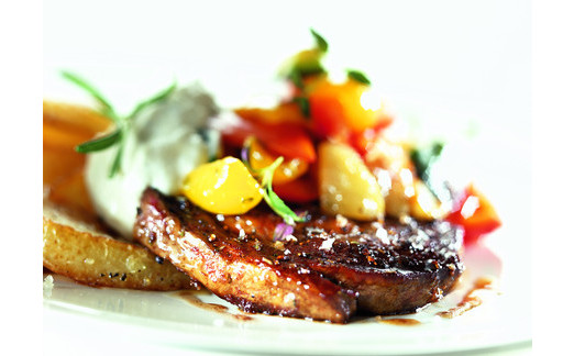 Servera köttet med ratatouille, chèvremousse och ugnsbakade potatisklyftor. Garnera med färsk timjan.