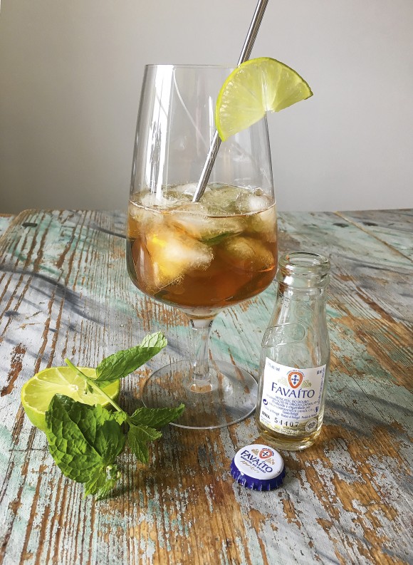 Lägg limeskivan och några myntablad i botten på ett stadigt glas. Stöt limeskivan och myntan försiktigt ett par gånger, använd gärna ett skedskaft. Häll i råsocker, sodavatten och Favaíto. Avsluta med iskross och rör om.