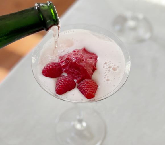 Lägg upp sorbeten i ett champagneglas eller en passande skål. Dekorera med några färska hallon och häll på champagne vid serveringen.