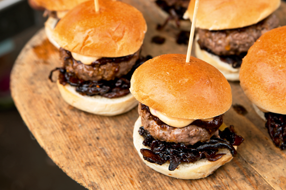 Rosta hamburgerbröden i en torr panna och stryk ett lager tryffelmajonnäs på bottnarna. Lägg på karamelliserad svamp och toppa med burgarna, skeda på lite extra majonnäs.