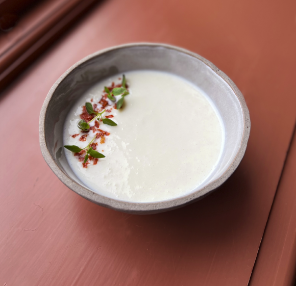 Värm soppan snabbt strax innan det är dags att servera. Garnera gärna med färsk timjan och bitar av rostad parmaskinka.