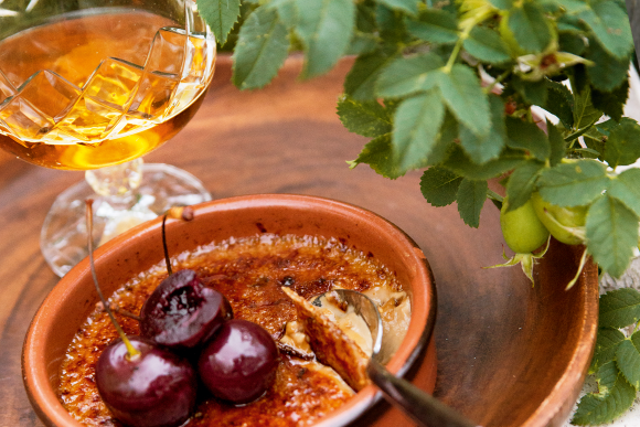 Strö ett tunt lager råsocker över brûléeformarna innan servering och bränn av med gasolbrännare. Servera med några körsbär och en liten avec.