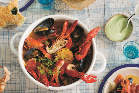 Borsta musslorna under kallt, rinnande vatten. Släng dem som inte stänger sig när du knackar på dem. Lägg musslorna i grytan och låt koka i 3-5 minuter under lock. Ta bort dem som inte öppnar sig. Lägg ner kräftorna på kanten, nu ska det inte koka mera utan bara värmas upp. Garnera med krondill och servera med aioli och ett gott bröd, gärna focaccia.