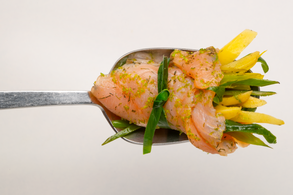 Stek hastigt ca 50 g strimlad paprika, 50 g finskuren sticklök och 50 g strimlad zucchini i lite olivolja och flingsalt. Servera med skivad limegravad lax (se recept). Går att köpa färdiggravad lax i butik och tillsätta lime.