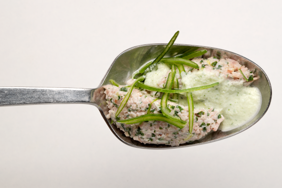 Blanda finhackad skinka, hackad lök, finhackad persilja med majonnäs och crème fraiche till en formbar smet. Var försiktig så att inte smeten blir för tunn.