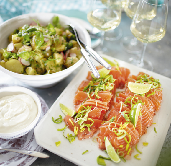 Frys laxen två dygn före eller efter gravningen. Blanda socker, salt och peppar. Gnid försiktigt in blandningen över laxen och strö över purjolök. Lägg laxen i en plastpåse eller en form med kant och plasta över. Låt stå framme i rumstemperatur i ett par timmar till sockret börjar smälta. Sätt in laxen i kylen och låt den stå i cirka 2 dygn, vänd den efter halva tiden. Skär upp den i tunna skivor. Dela laxen på mitten innan du skär upp den för att få fina bufféskivor. Blanda alla ingredienser till vitlökssåsen. Skiva potatisen eller dela den på mitten. Skölj och skiva purjolöken fint. Skär broccolin i små buketter. Vispa ihop senap, honung, vinäger och droppa i lite olja i taget under vispning. Smaka av med salt och peppar. Blanda potatisen, purjolöken, örterna och broccolin (kan förvällas) med dressingen. Garnera med Garnera med färska örter. Servera potatissalladen till laxen och vitlökssåsen.