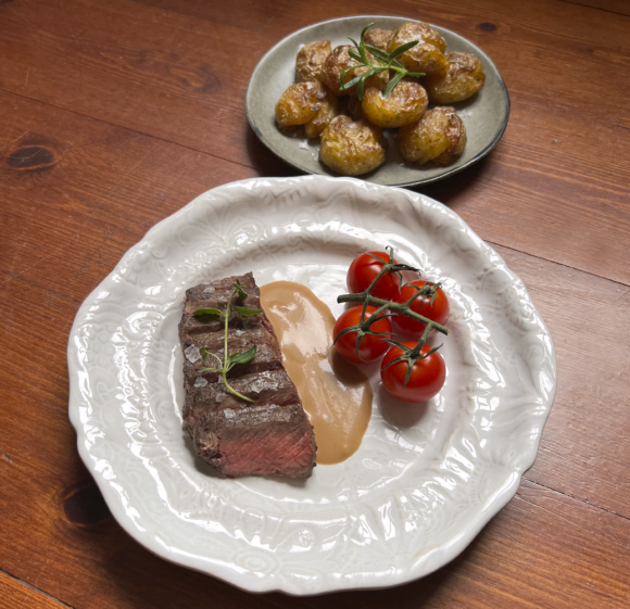 Servera ryggbiffen med krossad potatis samt madeirapepparsås.