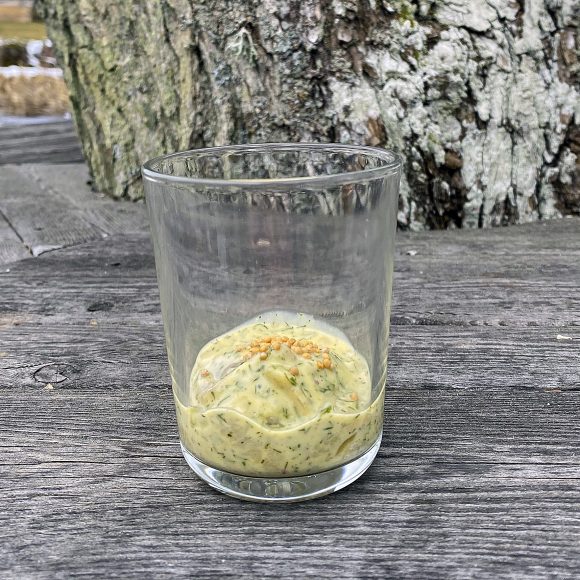 Blanda socker, salt, whisky och senap i inläggningslagen. Vispa ned rapsoljan och blanda därefter ned crème fraîche och dill. Täck bunken med plastfolie och låt stå ett dygn kylskåp.
